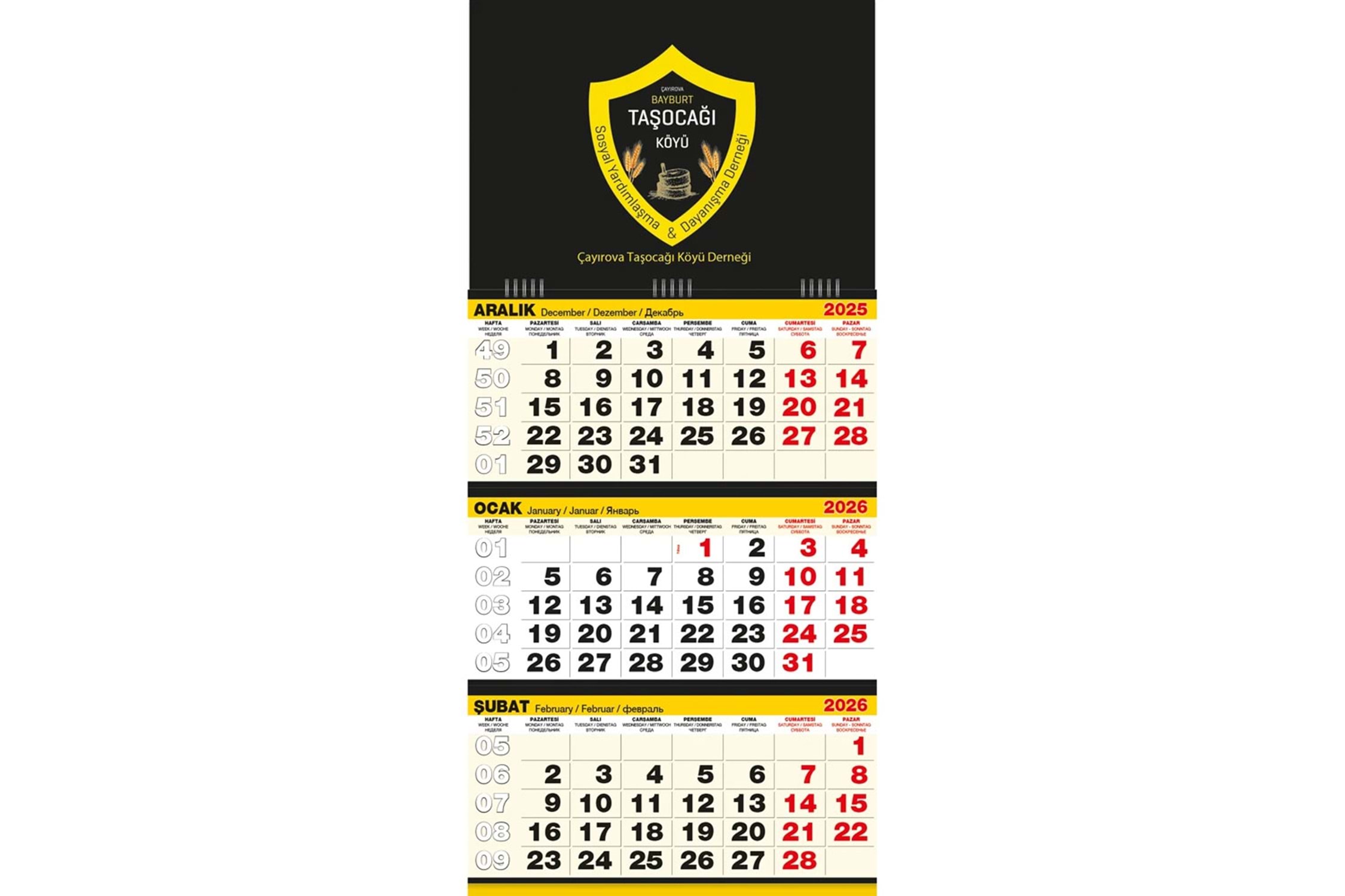 * Tek Parça Spiralli * Takvim Ebat: 33 x 73 cm * Ayna: 350gr. A.Bristol * Alt Karton: 350gr. A.Bristol * Reklam Alanı: 33 x 23 cm * Blok Ebat: 33 x 48 cm * Yaprak Kağıdı: 80gr. 1.Hamur