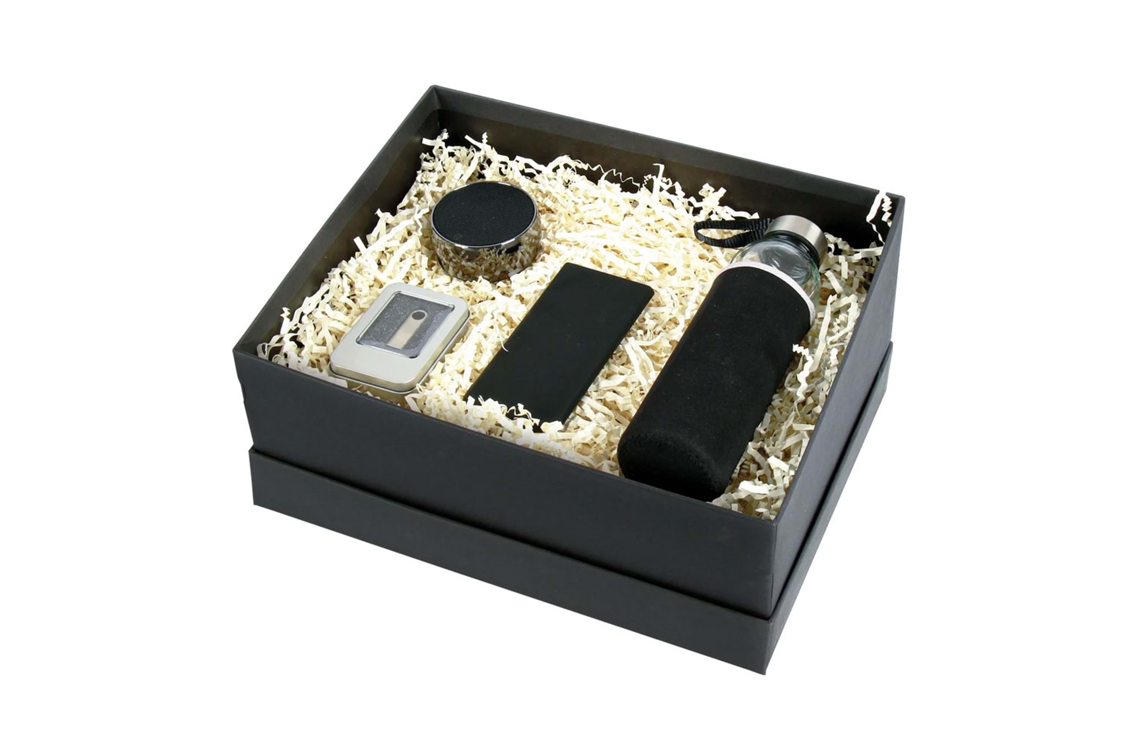 * Cam Matara 500 mL (CB-05) * Powerbank 5.000 mAh (PWB-905) / Işıklı Markalama * Titanyum Speaker (SPK-80) * Metal USB Bellek 16 GB (8115) * Kutu: Taslama