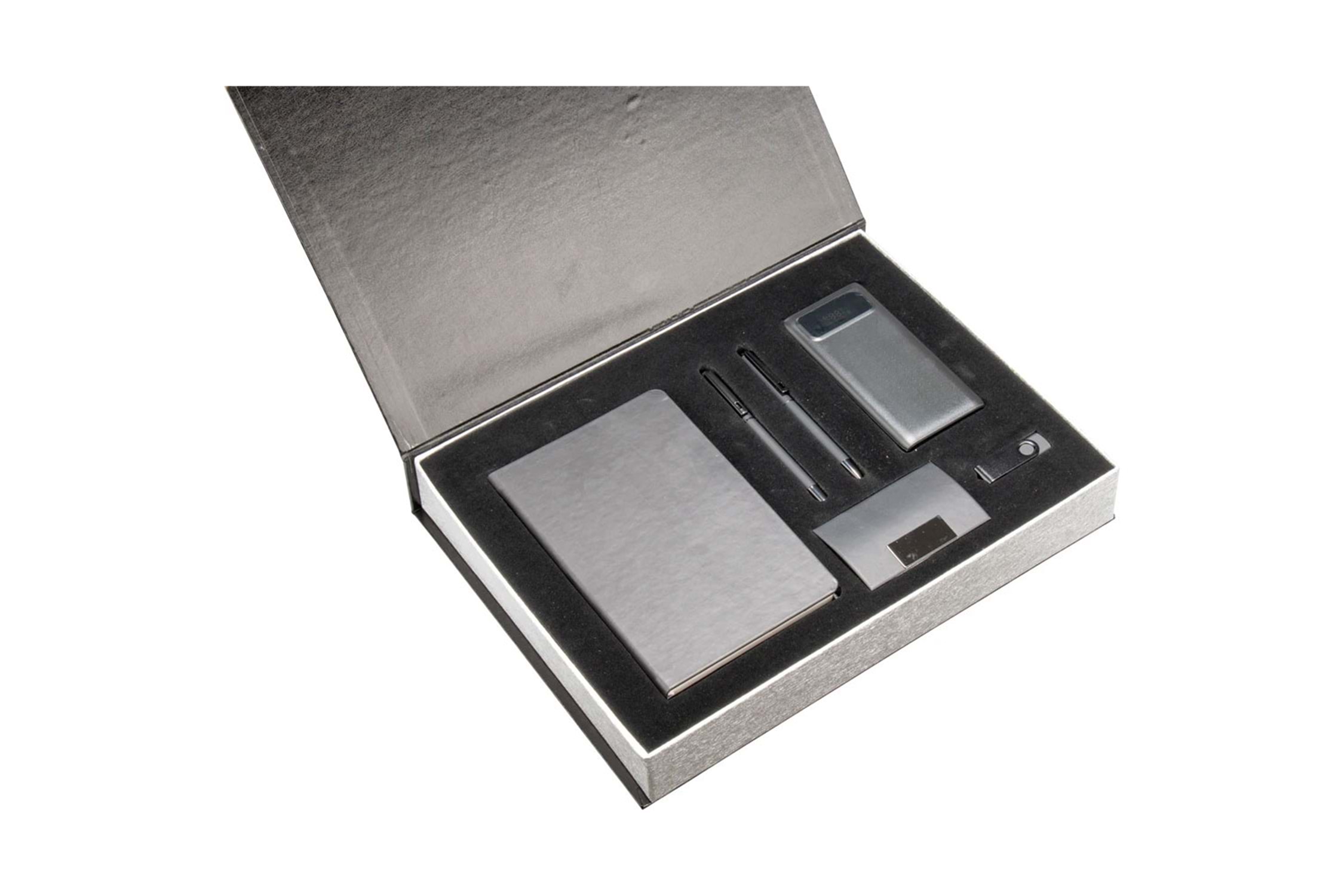 * Termo Deri Defter (Eskihisar 13x21 cm) * 10.000 mAh Powerbank (PWB-320) * Metal Kalem Roller ve Tükenmez (0555-480 / 0555-490) * 16 GB USB Bellek (8113) * Kartvizitlik (KVZ-007) * Kutu: Cilt Bezi